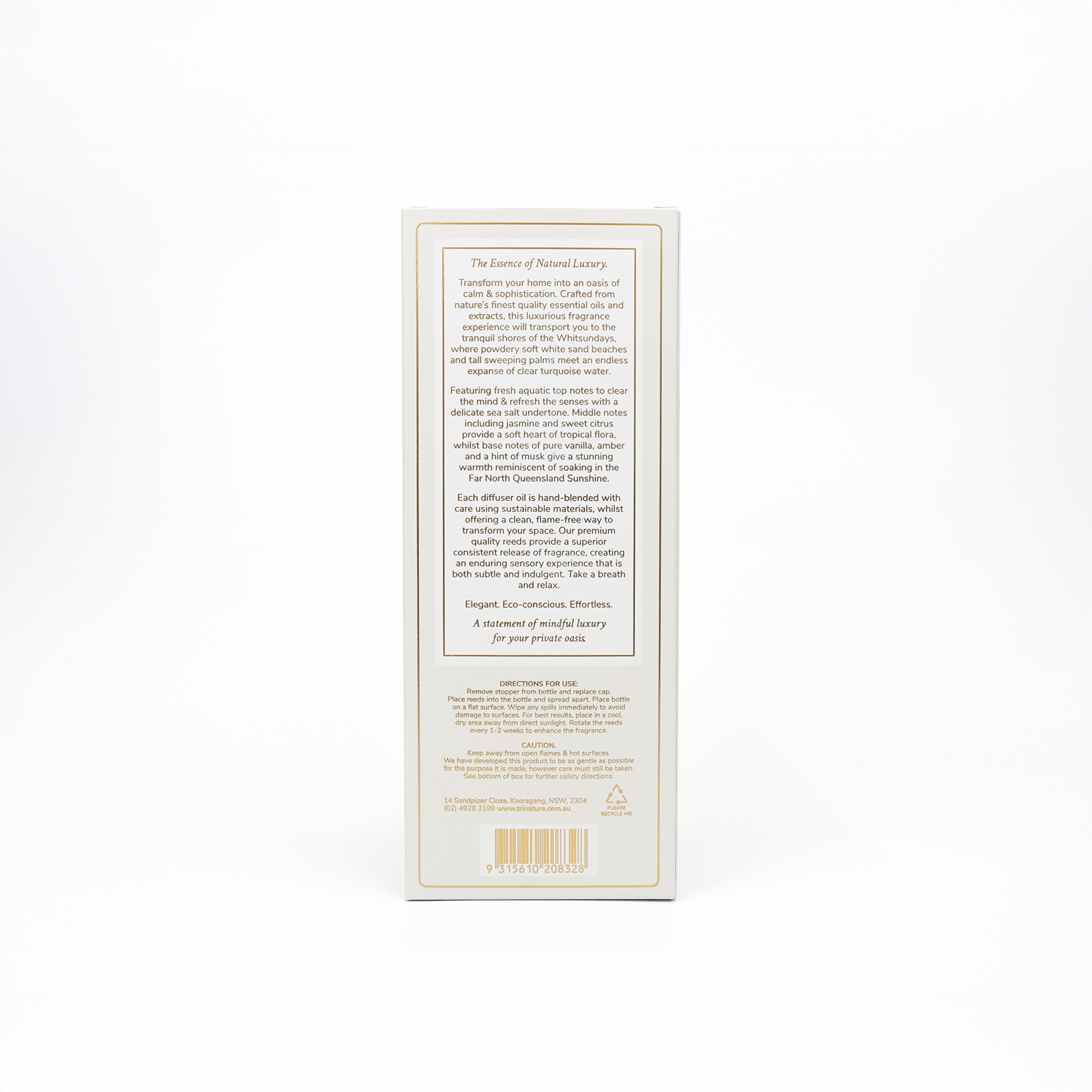 As the reeds gently draw the scented oil upward, the room slowly fills with a soft, lingering aroma that feels effortless and refined. The scent unfolds in layers, bringing the feeling of fresh ocean air, tropical blooms and warm Queensland sunshine into your home or workplace all without a flame. This premium essential oil-based diffuser delivers a beautifully balanced scent that fills the room with effortless sophistication, creating an atmosphere that feels calm, welcoming, and undeniably luxurious.